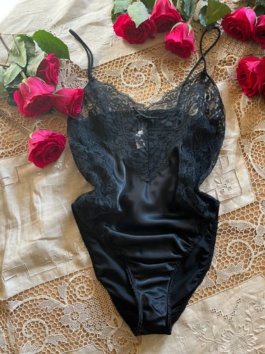 1980’s Vintage Black Satin High Cut Teddy by Laura Faye