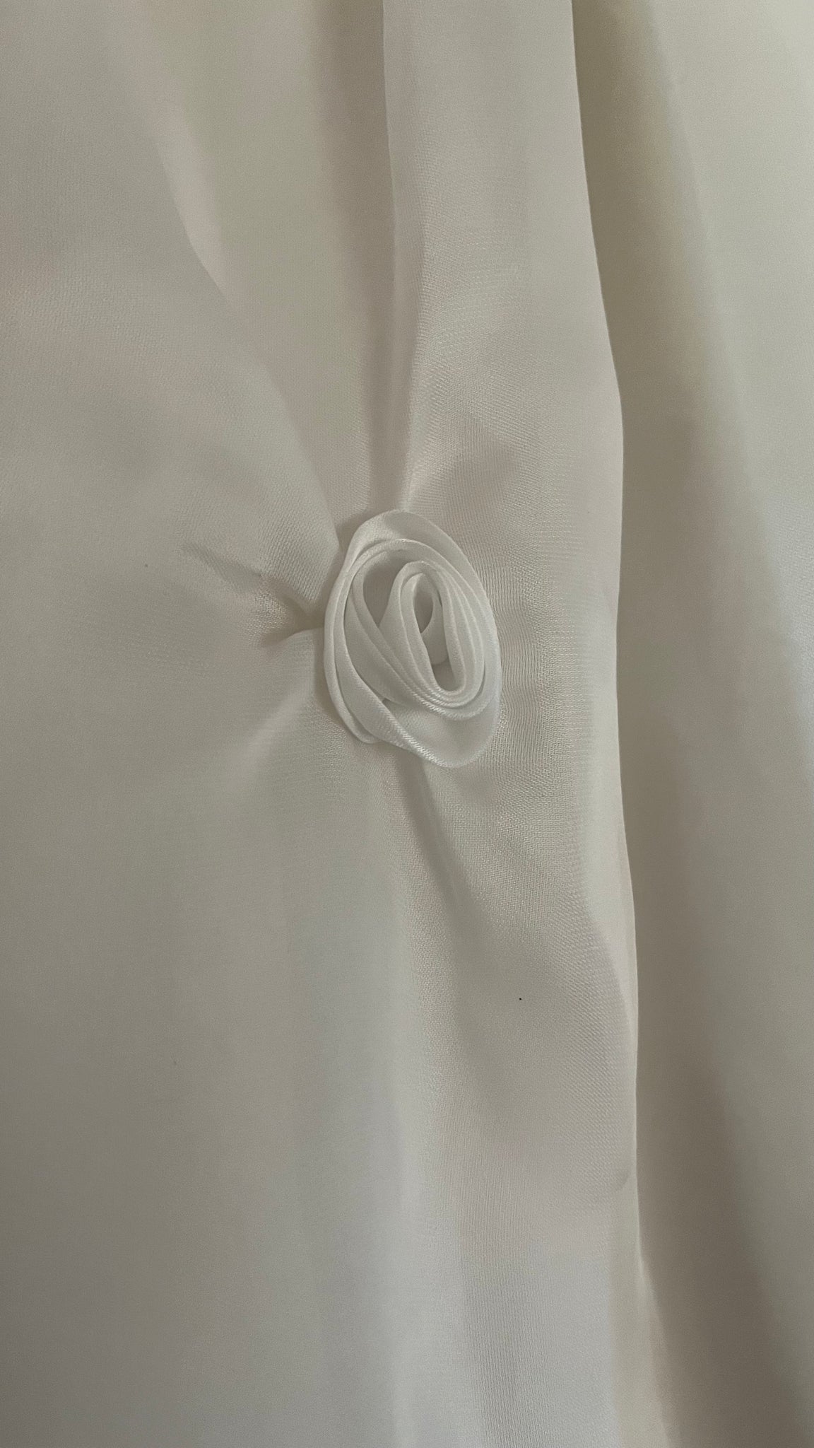 The outer layer is dove grey organdy gathered up with matching rosettes..
