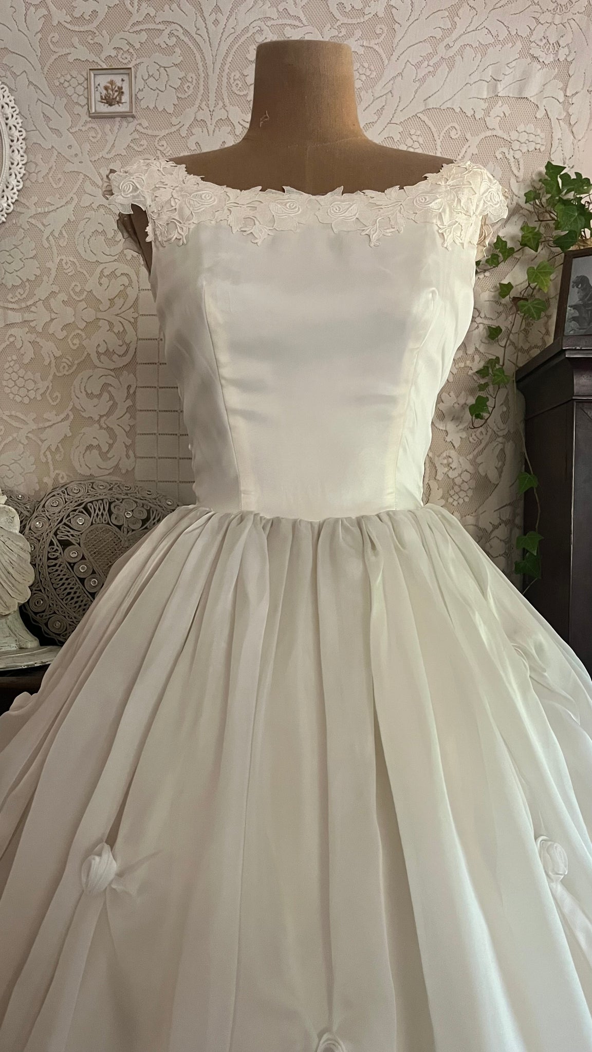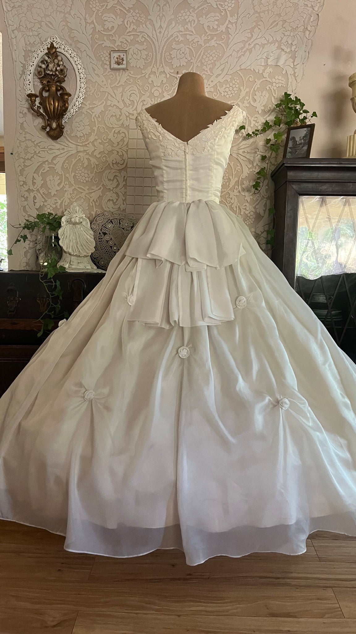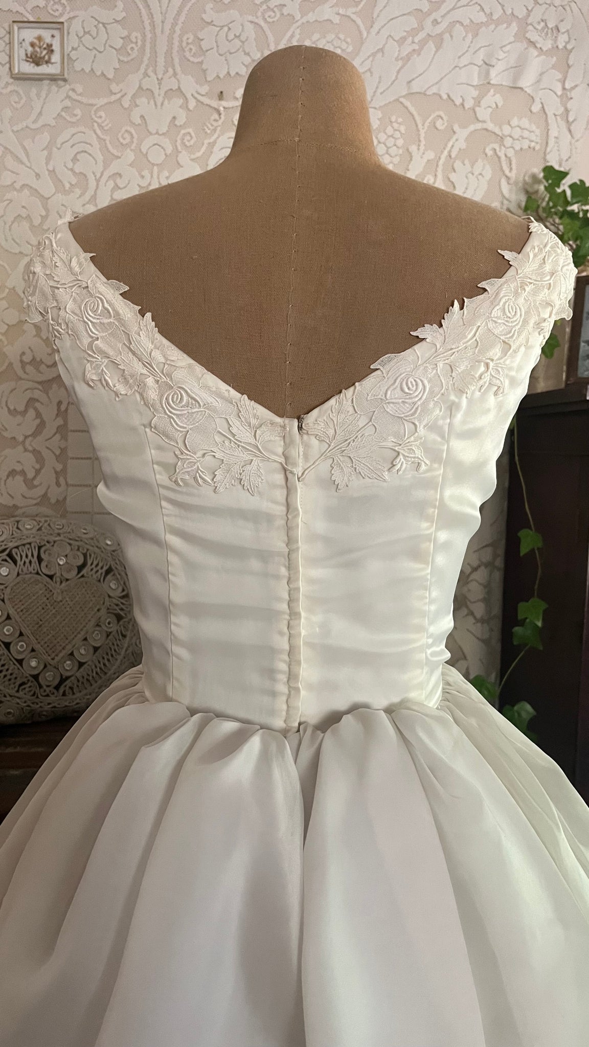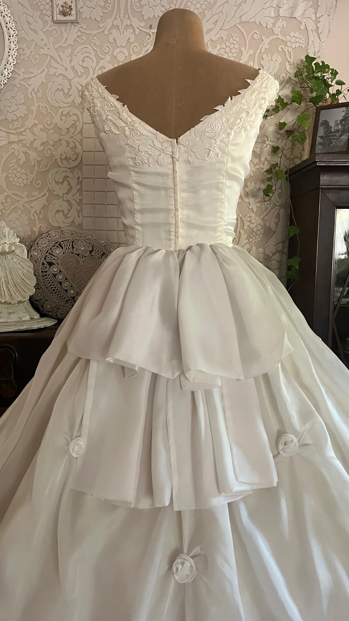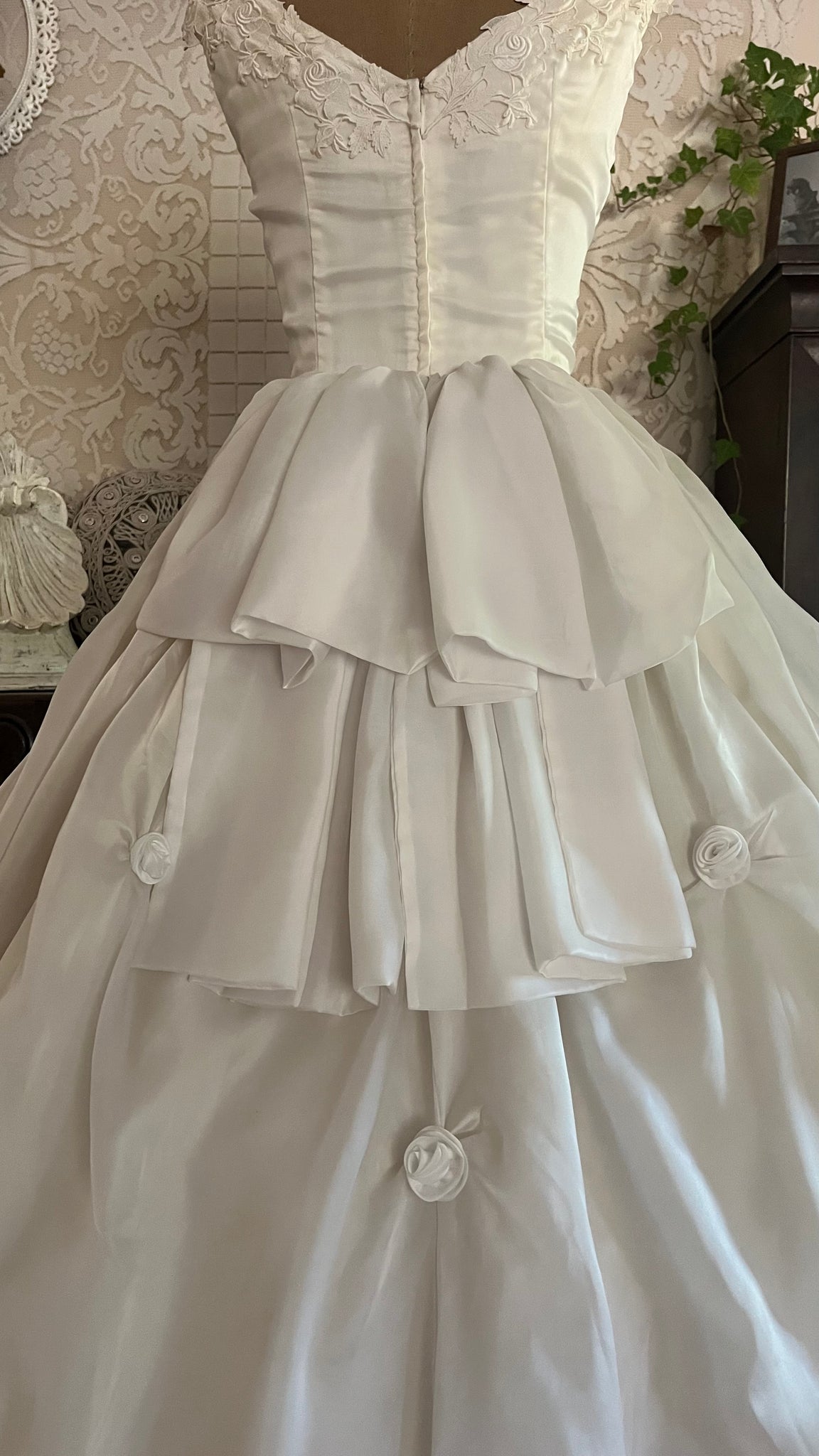 Displayed with a large bridal petticoat to show the fullness of the skirt and not included with the dress