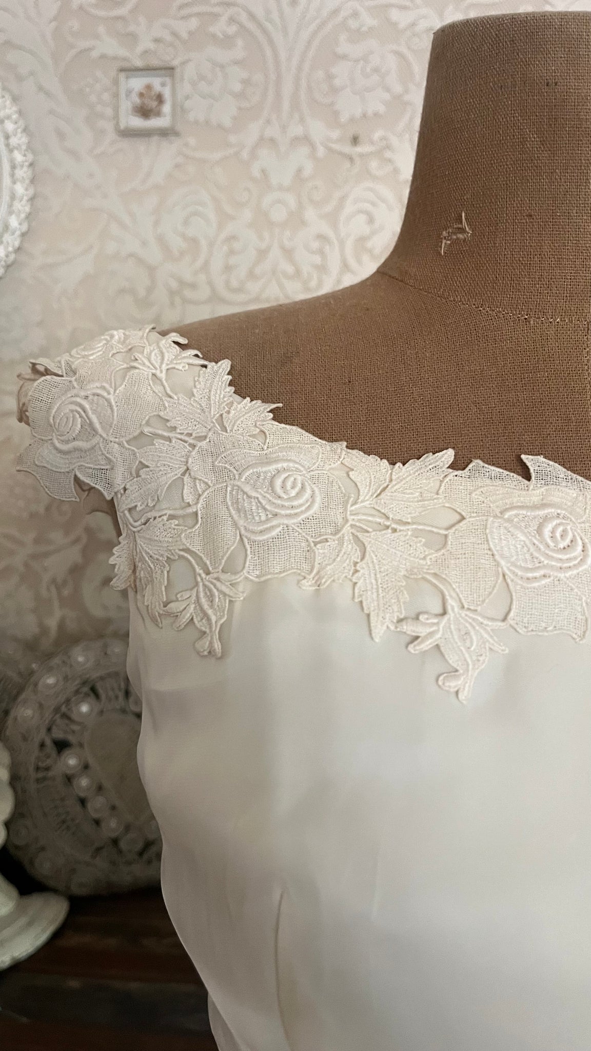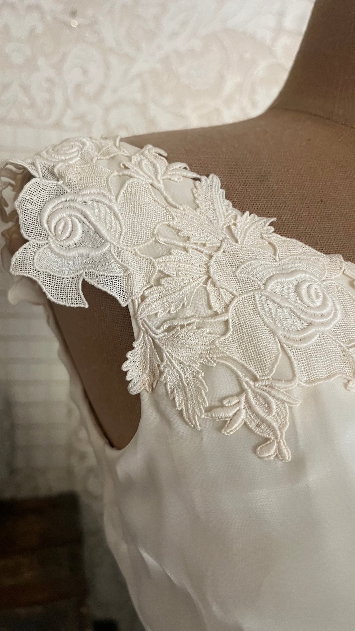 The neck is heavily ornamented with amazing rose embroidered appliqués..