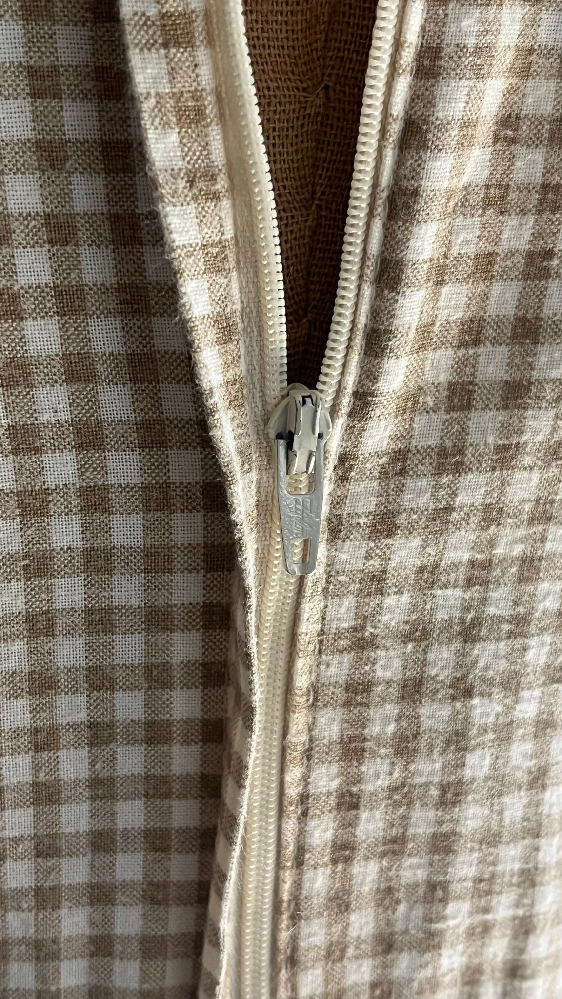 The gingham is a pretty creamy beige,