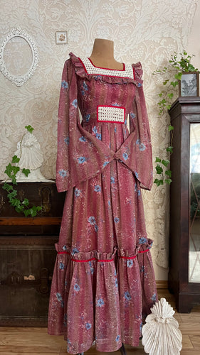 Lovely 1970’s Vintage Mauve and Blue Rose Print Angel Sleeve Dress