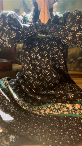Authentic 1970’s Vintage Black Calico and Velveteen Trapeze Gunne Sax Midi Dress