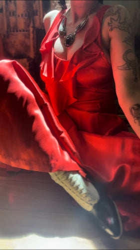Rare Showstopper 1960’s Vintage Liquid Red Satin Ruffle Maxi Dress