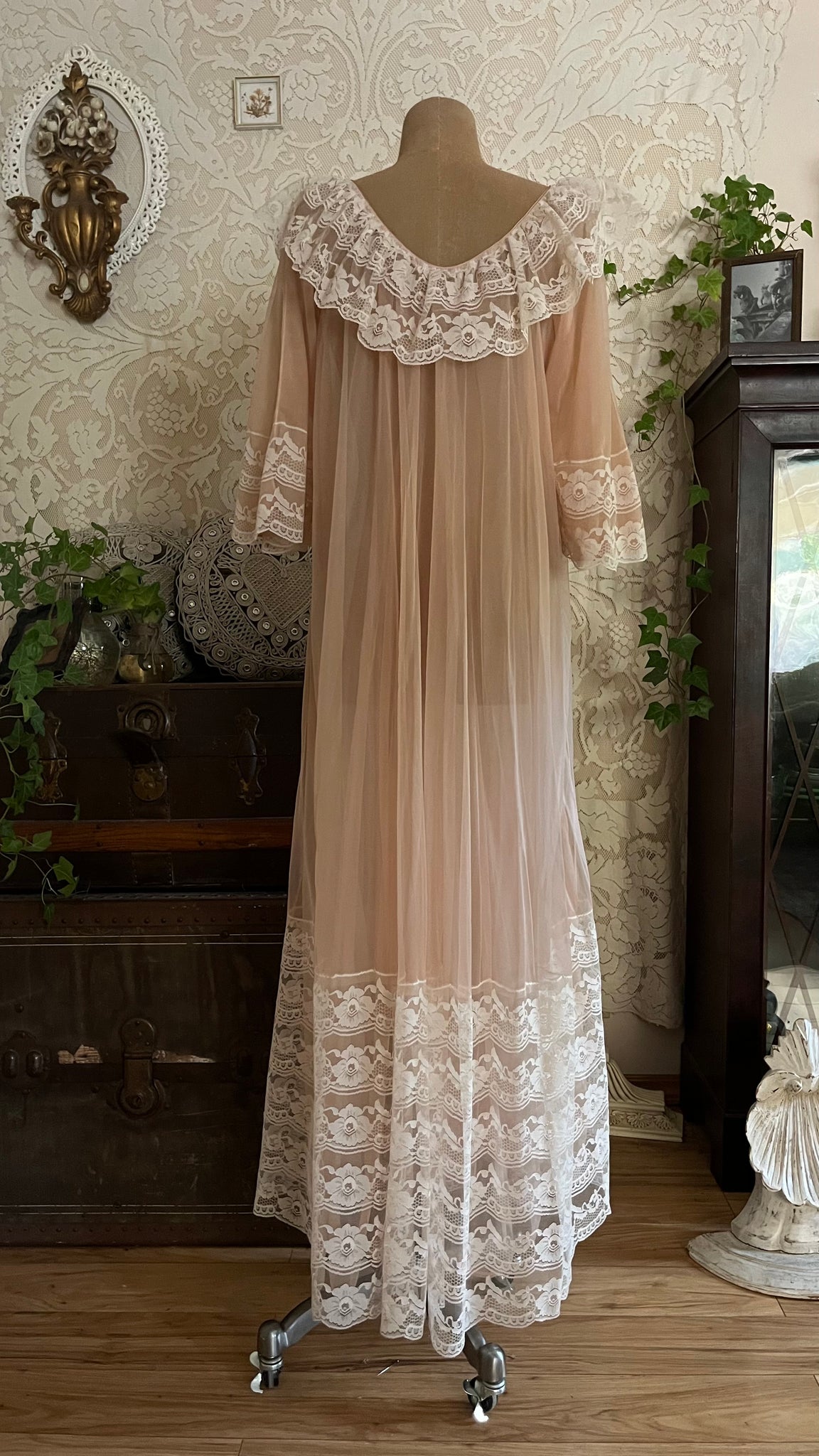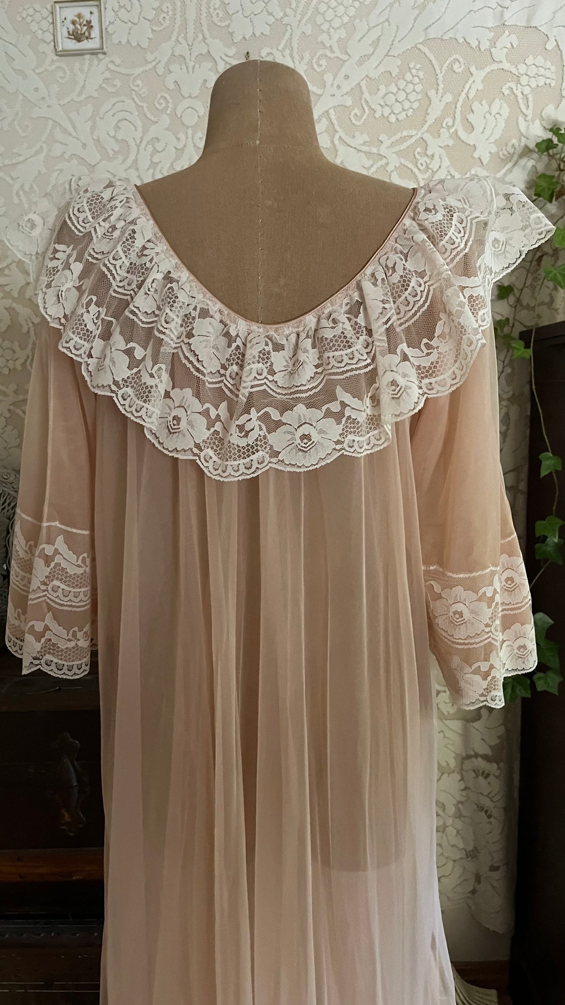 Latte beige nylon chiffon and ivory lace peignoir robe by Intime of California.